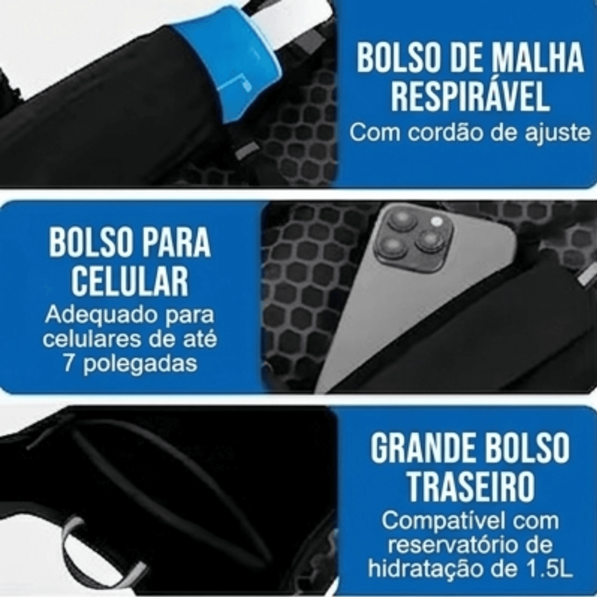 👉 Compatibilidade de Celular: Compartimento seguro para dispositivos de até 7 polegadas.