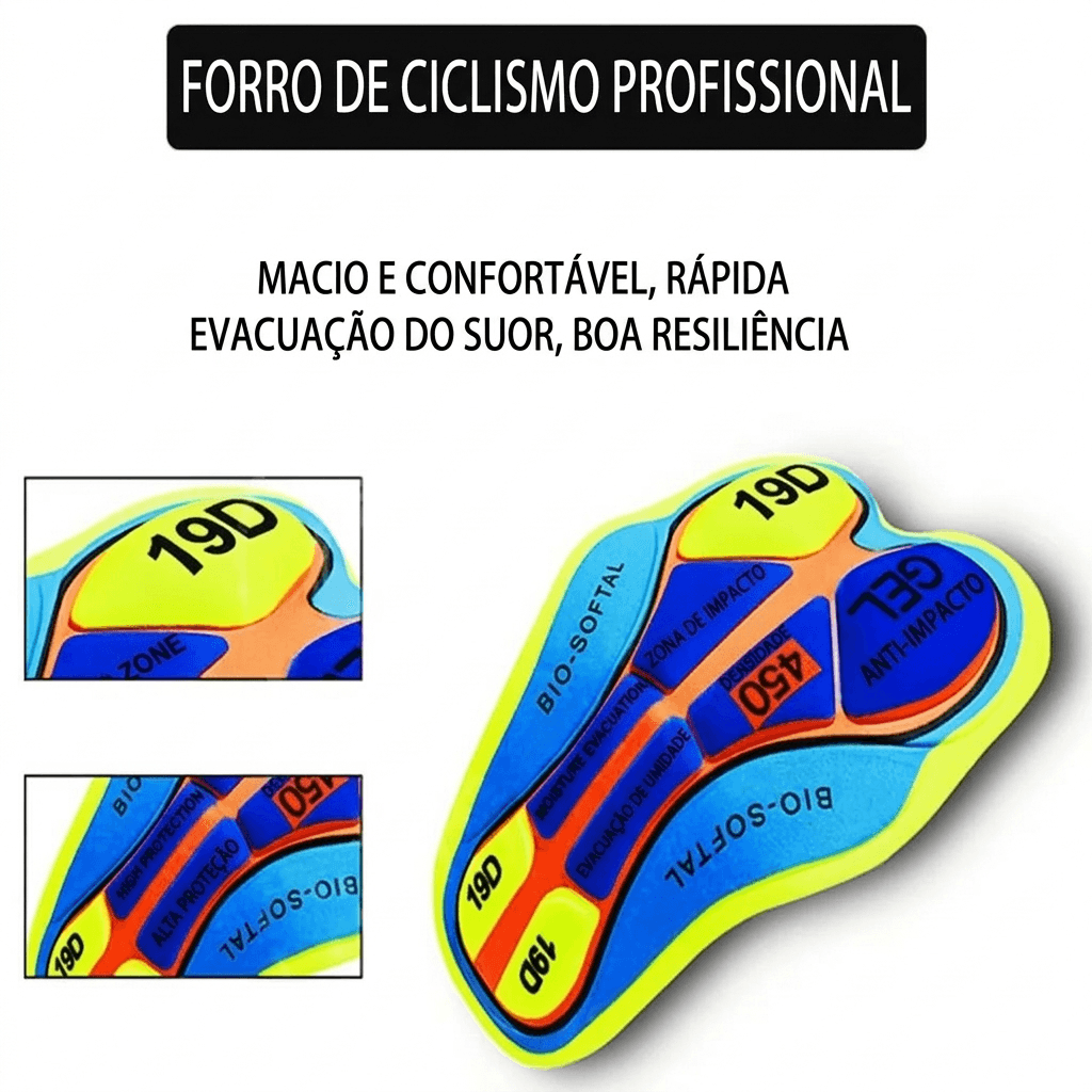 ✔️ Almofada de Alta Performance: Pad 19D com perfuração a laser, ideal para absorção de impacto e respirabilidade da região pélvica.
